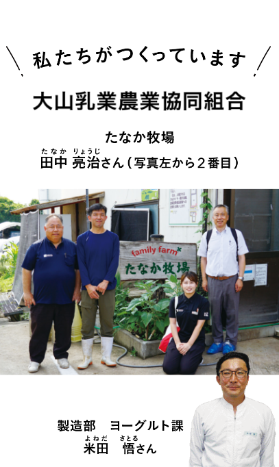 田中さんが力を入れているのは、牛たちの大切なエネルギー源となる飼料づくり。他の酪農家と共同で栽培したトウモロコシを、「たなか牧場」では飼料の40%に使用。栄養たっぷりの餌と大山地区のきれいな水を与え、牛たちを健やかに育てることで質の高い生乳を生み出しています。「飲んでもらったら違いが分かるから!」という酪農家たちの自信は、並々ならぬ努力に裏打ちされているのです。