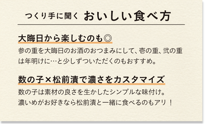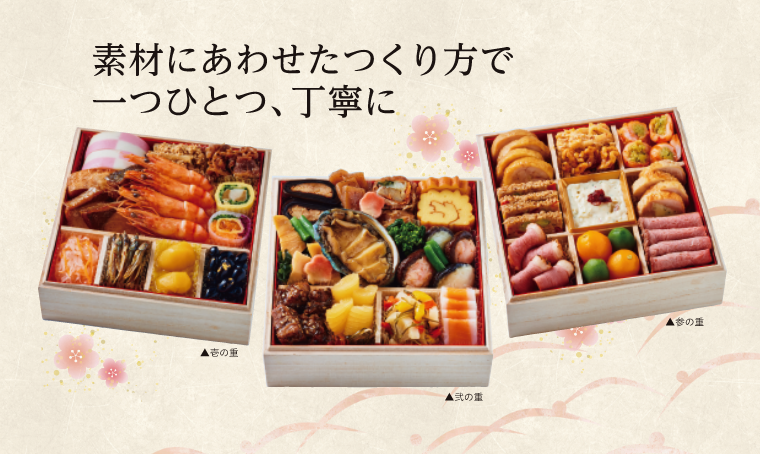 そして、おせちにおいて最も重要なのがバランス。「おせちは壱から参の重、全体で一つの料理。昔ながらの安心感と新しいおいしさの両方を味わえる、そして“目で味わう楽しさ、美しさ”を感じていただけるよう、考え抜きました」と、小池さん。