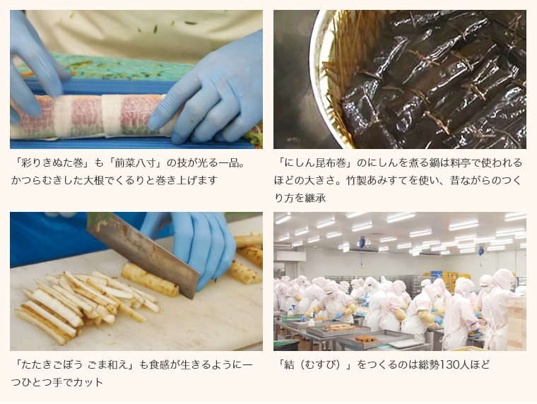 銀の森が誇る「前菜八寸」、つまり会席料理の前菜をつくる技術が全面に生かされているのが「鯖(さば)ざく巻(画像A)」。しめ鯖、きゅうり、生姜を錦糸玉子で丁寧に、一つひとつ手で巻き上げました。彩り、食感、味の調和のすべてにおいて、板前の繊細な技が光ります。「にしん昆布巻(画像B)」は、料亭などと同じような小さな鍋で何時間も、何度も煮炊きを繰り返し味を染み込ませます。「真昆布はやわらかくなるまで時間がかかるし、小さな鍋では生産効率も高くはありません。それでも、おいしさ最優先で伝統の味を守り続けています」と小池さん。
