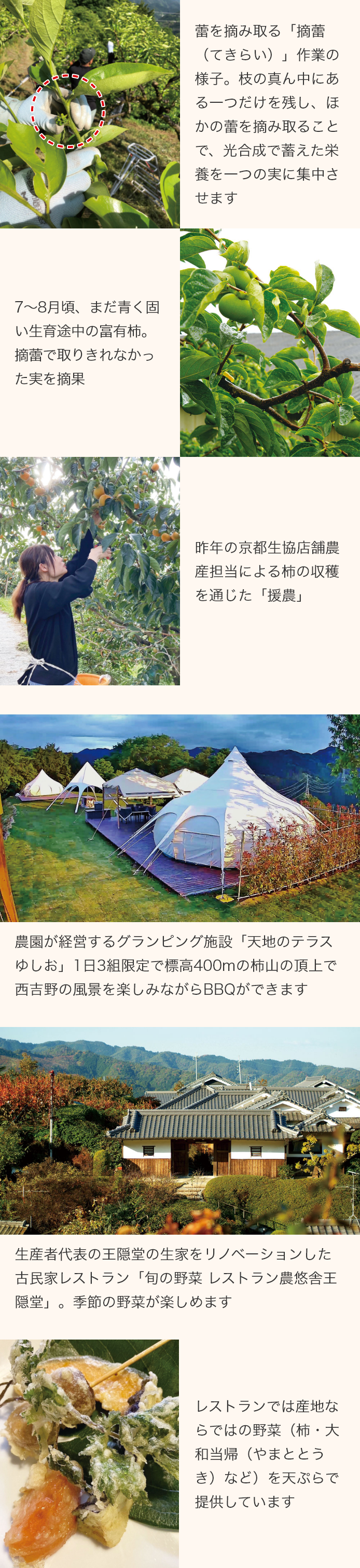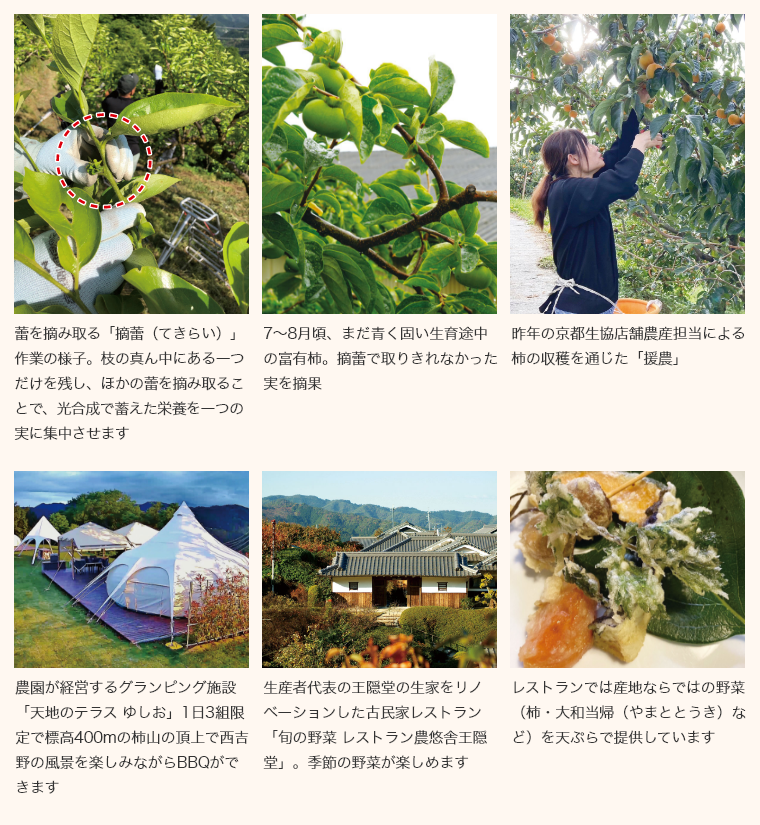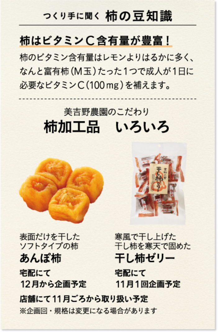 「温暖化の影響もあり、段々とつくりづらくなっていますが、1年に1作の想いをこめてわが子を育てるように柿と対話して頑張っています」と話す和田さん。美吉野農園では、生産するすべての柿を大切に、あんぽ柿などの加工品の開発・販売を自社で行うことで、無駄なく消費者に届けることができています。「すべてを出荷し、すべてを食べてもらいたい」という美吉野農園の想いには、農業への誇りと、つくる人と食べる人へのやさしさが詰まっています。近年ではレストランやグランピング施設の運営も行い、農業への理解を深める活動も。和田さんは「ただ届けるだけが“産直”ではありません。価値を実感して手に取っていただければ」と想いを熱く語ります。知らずに食べるのと、知って食べるのでは大違い。産地の物語を知った分だけ濃厚になる、富有柿の味わいをお楽しみください。