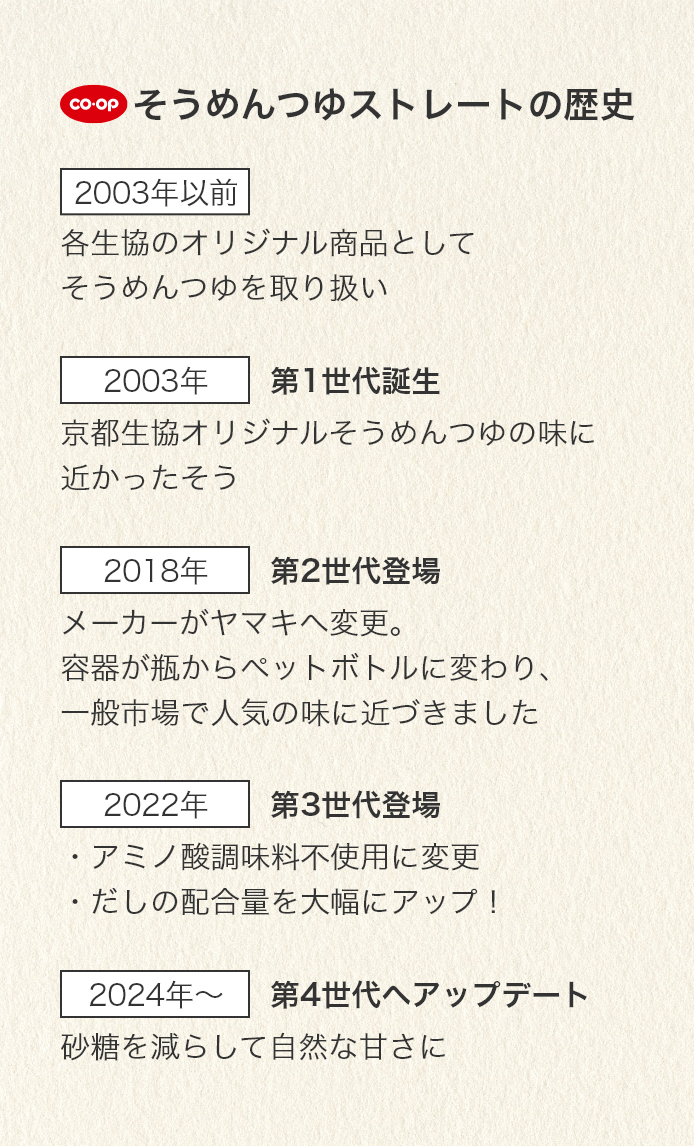 そうめんつゆストレート」第1世代が誕生。これまでの味わいを守りながら、より多くの組合員に届けられる商品を目指しました。