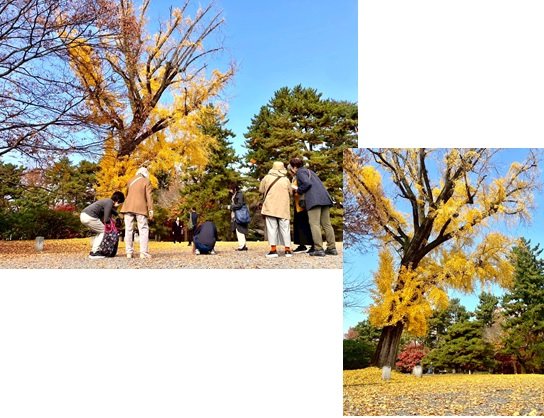 黄色の葉に覆われた銀杏の大木の前で、若い会員さんから「スマホを逆さにして地面近くから撮影すると、ダイナミックなアングルになる」とのアドバイスがあり、年配の方々も挑戦。紅葉を背景に「はい、ポーズ」と撮影し合い、笑顔があふれるひとときとなりました。