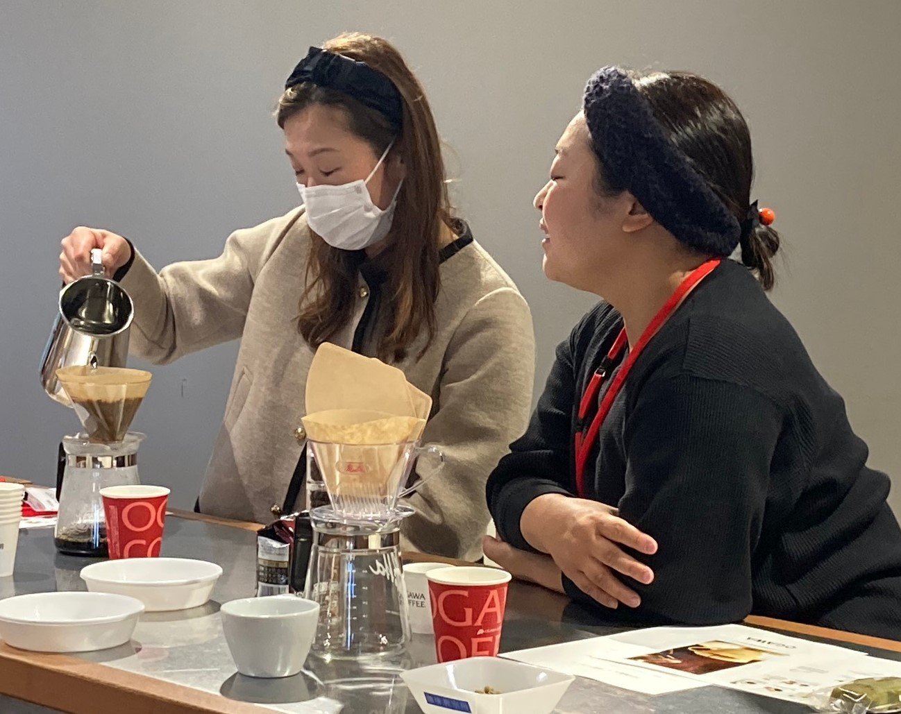 コーヒーができるまでの小川珈琲こだわりのお話を聞き、美味しいコーヒーの淹れ方を学びました。