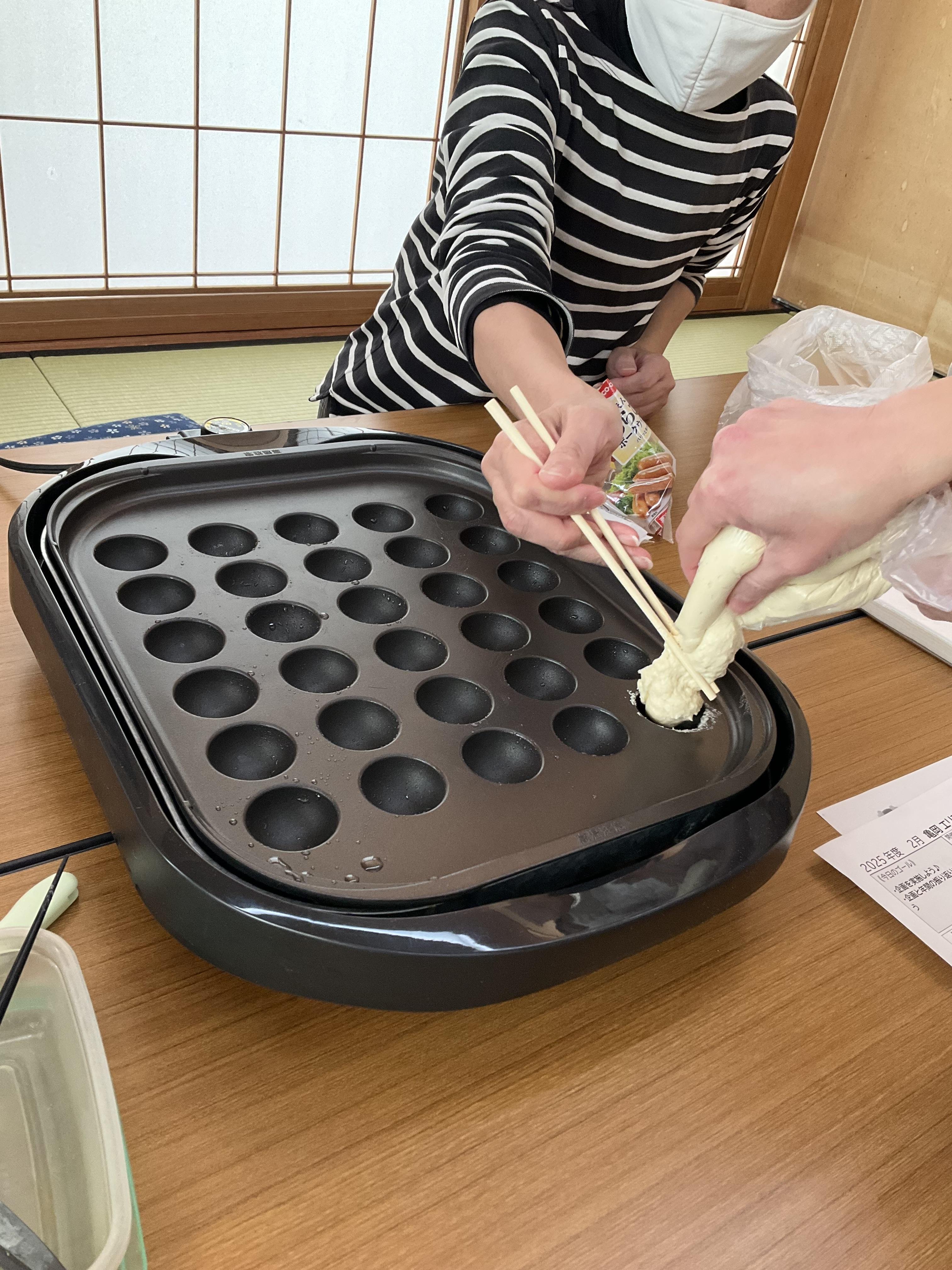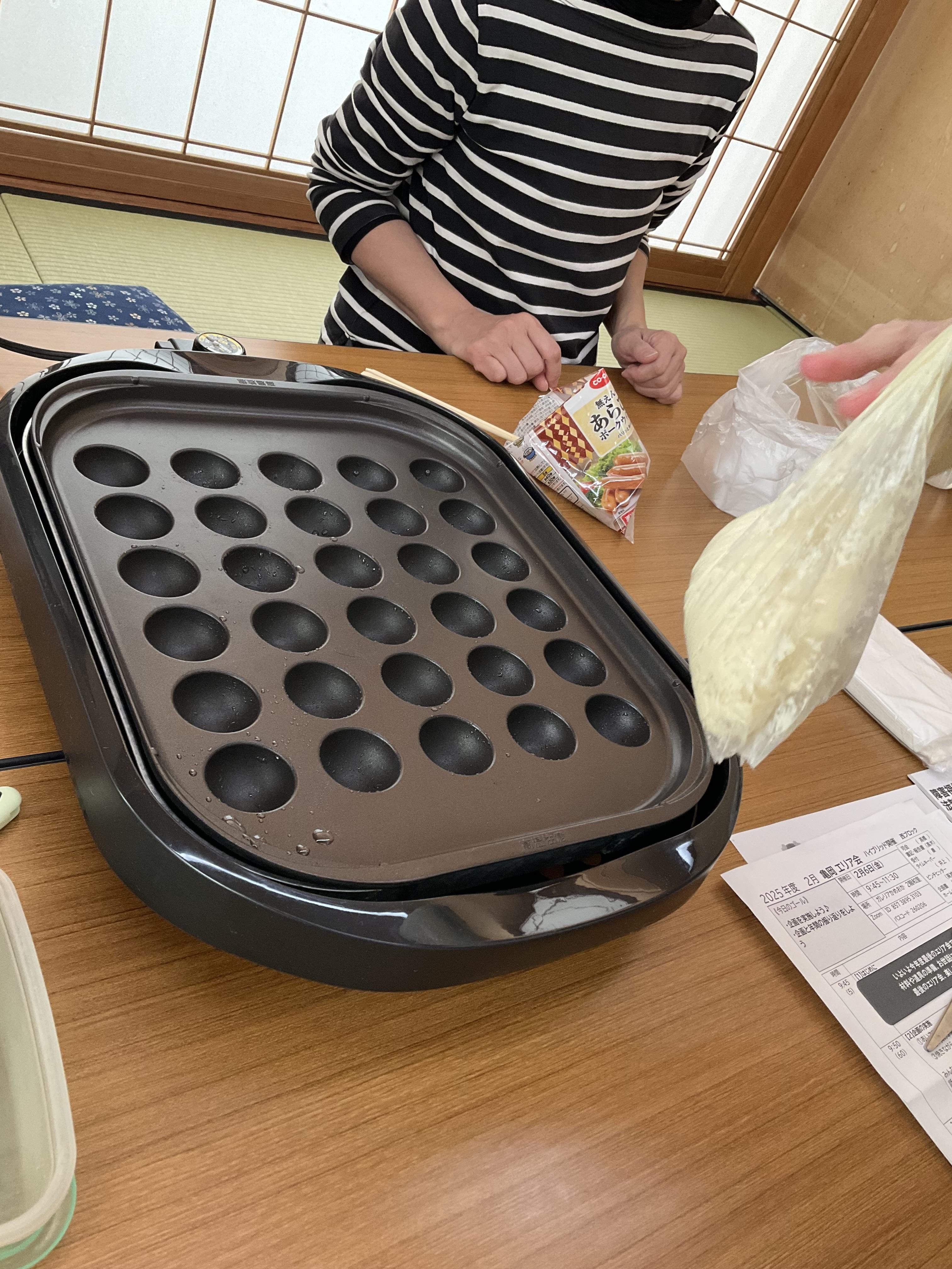 節約料理のメニューはタコ焼き型お豆腐入りパンケーキです!具はウインナーとチョコレートを用意しました。