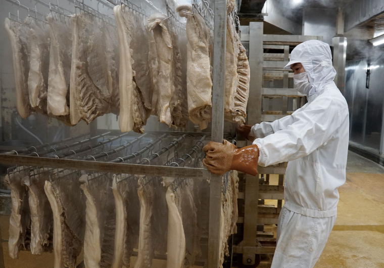 香ばしい匂いを立ててカリッと焼き上がったベーコンは、朝の食卓にあるとうれしいものの1つ。長年のファンが多い「京都生協コープ商品原形スモークベーコン」は、国産の豚肉本来の味わいを大切にしたベーコンです。製造しているのは大阪府羽曳野市(はびきのし)にあるタケダハム株式会社の本社工場。「京都生協コープ商品ブルストウインナー」など、京都生協コープ商品の加工肉部門を支える会社です。