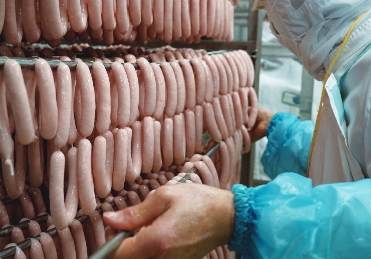 組合員のこだわりを詰めこんだKYOTOCOOPマークブルストウインナーの製造には、タケダハムの技術も詰まっています。特に注目すべきは、「練り・乾燥・スモーク」の3つの工程。「練り」では昆布・かつおエキスなどを調合した調味液で味付けしながら肉を細かく刻み、練り合わせます。「肉の食感の残し具合が重要。目で見て、手で触って、練り加減を微調整するのがベテランの仕事」と、木村さん。練った肉を羊腸に詰め、つるして乾かす「乾燥」具合がパリッと食感を生み出す秘訣だそう。スモークには、甘く香ばしい香りが一番お肉に合うというサクラのチップを使用しています。「この配合や製法はKYOTOCOOPマークブルストウインナーだけのもの。京都生協の組合員さんのためだけにつくった“オーダーメイド”です」と、森川さん。