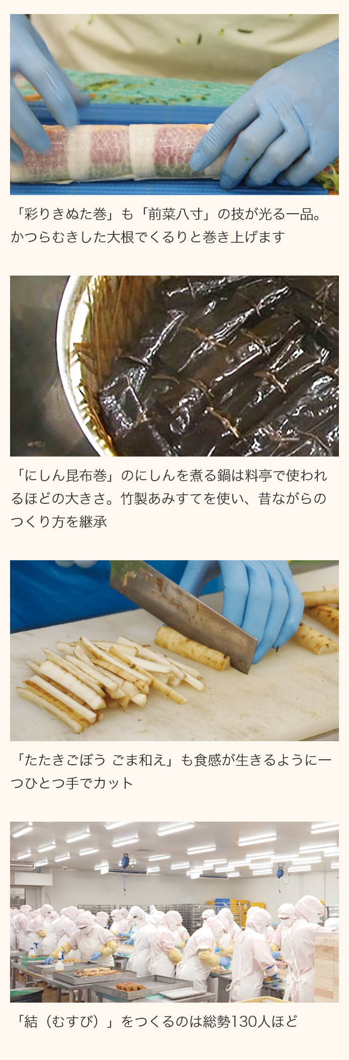 銀の森が誇る「前菜八寸」、つまり会席料理の前菜をつくる技術が全面に生かされているのが「鯖(さば)ざく巻(画像A)」。しめ鯖、きゅうり、生姜を錦糸玉子で丁寧に、一つひとつ手で巻き上げました。彩り、食感、味の調和のすべてにおいて、板前の繊細な技が光ります。「にしん昆布巻(画像B)」は、料亭などと同じような小さな鍋で何時間も、何度も煮炊きを繰り返し味を染み込ませます。「真昆布はやわらかくなるまで時間がかかるし、小さな鍋では生産効率も高くはありません。それでも、おいしさ最優先で伝統の味を守り続けています」と小池さん。