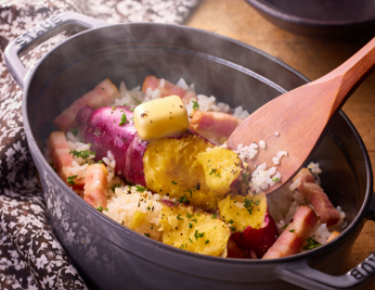 - 2. 鍋にAを入れてひと混ぜし、ベーコン、よく洗ったさつまいもを丸ごとのせる。蓋をして火にかけ、沸騰したら弱火で約15分、火を止めて約10分蒸らす。