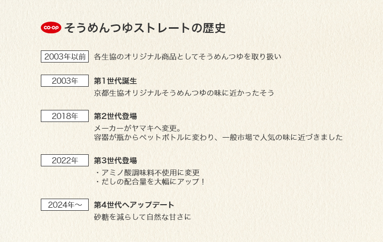 そうめんつゆストレート」第3世代が登場します。事前に組合員モニターの試食も行い、万全を期しての送り出しでしたが、それでも寄せられた「甘すぎる」という声に応え、2024年には砂糖を減らしてスッキリさせた第4世代にアップデート。一人ひとり異なる味覚であっても、こうした声に真摯に向き合い続け、少しずつ改良され今日に至ります。「