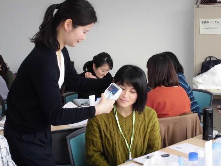 まずはコープ基礎化粧品が無香料、無着色、余分なものを使用しておらずお肌に安心・安全ということを説明されました。次に参加者一人一人の肌チェックをしてくださり、今は冬のせいもあり、乾燥肌の人が多いということがわかりました。そしてコープコールドクリームを使ってクレンジング。ここで丁寧にマッサージの仕方を教わりました。クレンジングというと化粧を落とすだけだと思っていましたが、マッサージによって血行を促進し、しわ・たるみを防ぐことを知りました。念入りなマッサージでお肌がイキイキしてきたところで、化粧水、美容液、乳液、クリームでたっぷり保湿し、こんなに塗るんだねーという声も上がりました。