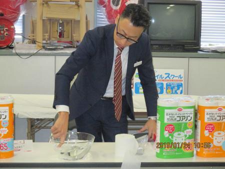 亀岡Bエリア会では1月24日、南丹支部会議室で、コアノンロールを製造しているリバースの五十棲さんを講師に「トイレットペーパーの学習会」を開催しました。
