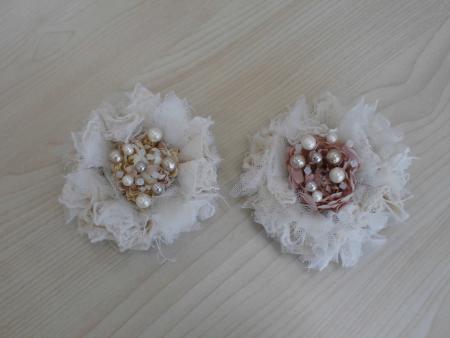 コサージュの土台となるフェルトに小さくカットされたチュールレース3種類と麻布を折って、1枚ずつグルーガンで花びらのようにつけていきます。