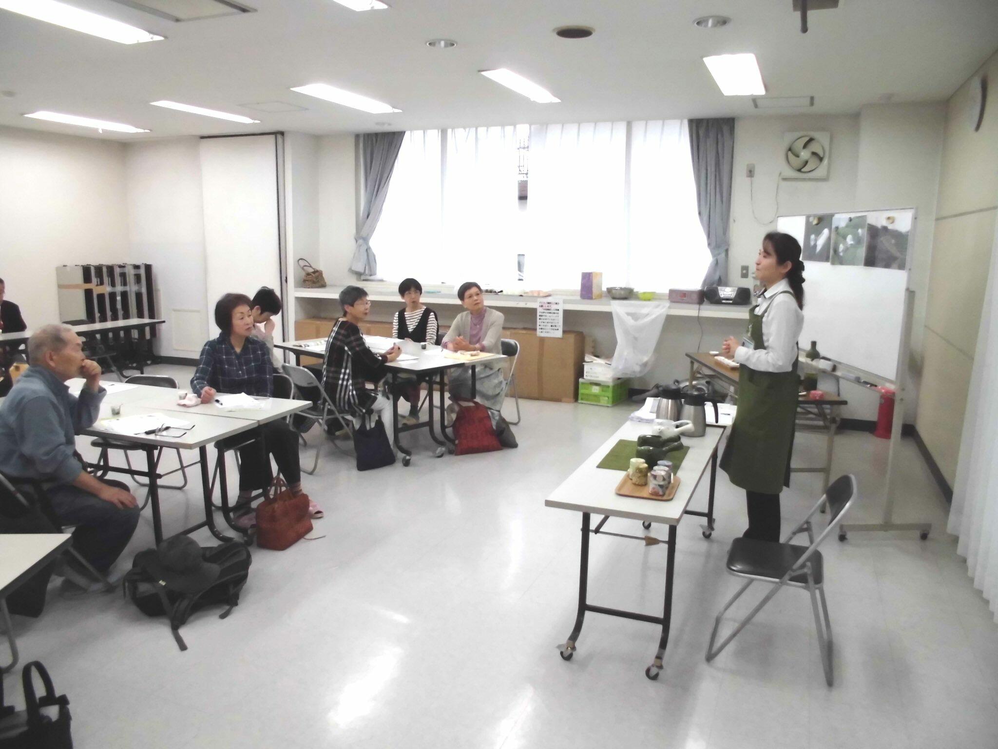 4月25日(木)コープ宇治神明、地階第1教室にて和束茶カフェの日本茶インストラクターに来ていただき、「玉露と煎茶の飲み比べ」 玉露のおいしい淹れ方の実演を見学しました。