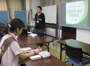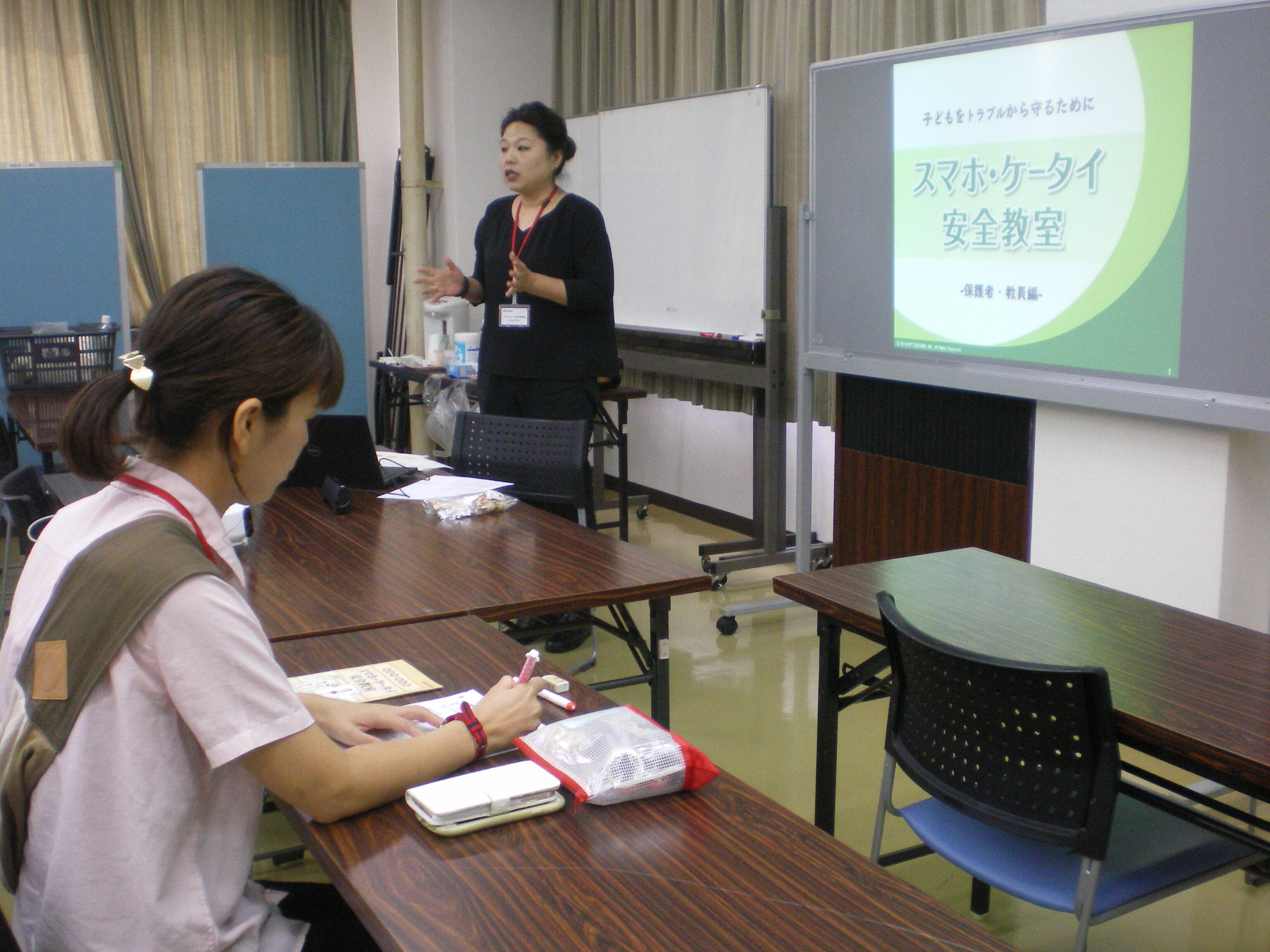 ということで、NTTドコモから講師の方を招いて「スマホ・ケータイ安全教室(保護者・教員編)」を受講しました。今回は「保護者・教員編」として、子どもたちが巻き込まれがちなネットトラブルなどについての動画を観ながら、SNSやネットゲームのメリット・デメリットを学習しました。