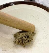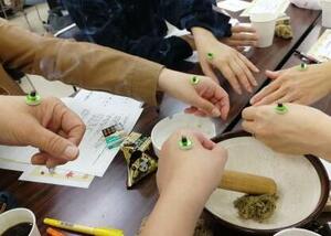 お灸は何からできている?チームで交代しながら、ヨモギをすり鉢で擦ると・・・ふわふわの塊になりました。