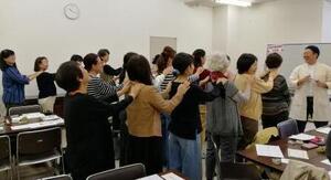 まずはじめに、前屈・後屈をし、自分の柔軟性を確認しました。それから、前の人の肩に手のひらを当てて肩を温めます。これだけでも、わぁ~肩が楽になった!などの感想が早速チラホラ。