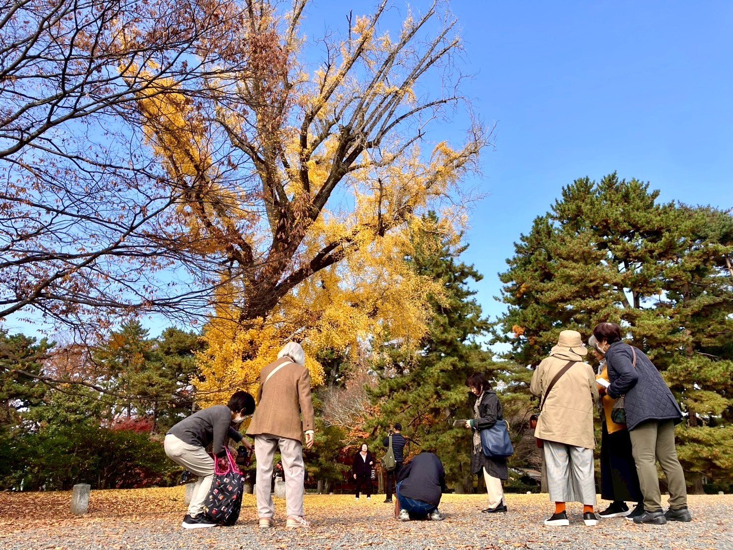黄色の葉に覆われた銀杏の大木の前で、若い会員さんから「スマホを逆さにして地面近くから撮影すると、ダイナミックなアングルになる」とのアドバイスがあり、年配の方々も挑戦。紅葉を背景に「はい、ポーズ」と撮影し合い、笑顔があふれるひとときとなりました。