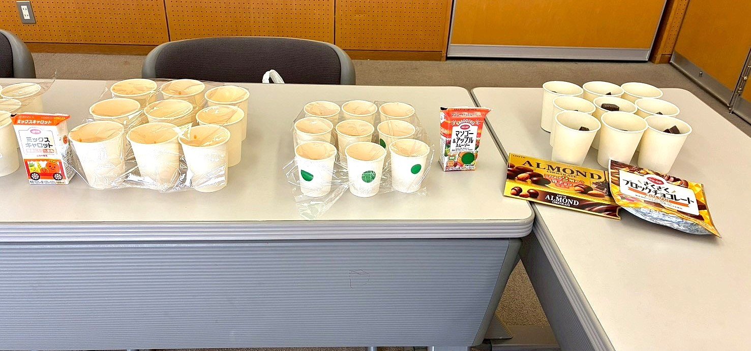 さまざまある『もったいないを活かす』商品の中から、芋けんぴ製造時に出るかけらを使用した「ざくざくブロックチョコレート」やブロッコリーの茎やアスパラガスの根元を使用したスムージー、森林資源の保全の証であるFSC認証パッケージのにんじんジュースなどの比較を行いました。![]()