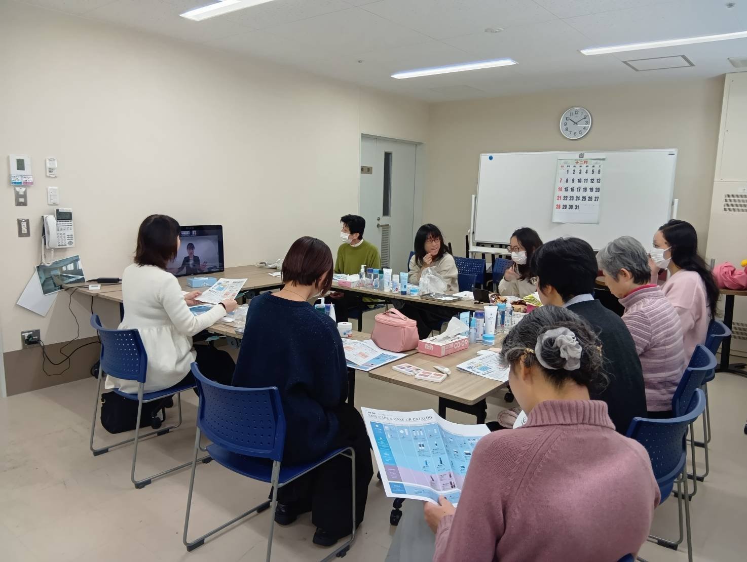 コープの基礎化粧品を実際に手に取りコスメチックスの講師さんと一緒にスキンケアの方法や、メイクアップ体験をしました。